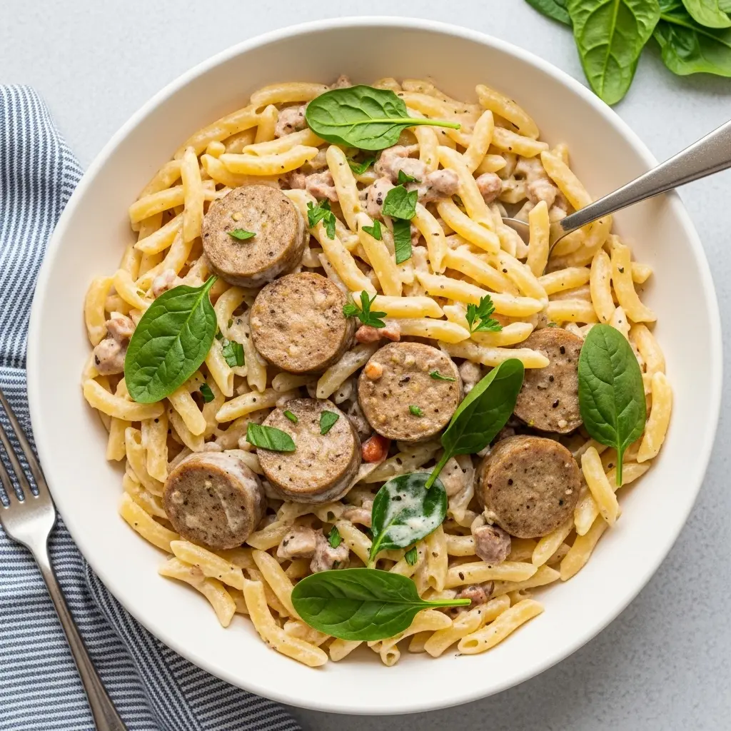 This is the comfort food you crave, but it comes together in under 30 minutes. The creamy sauce, savory sausage, and fresh spinach create a pasta dish that tastes like it came from a restaurant.