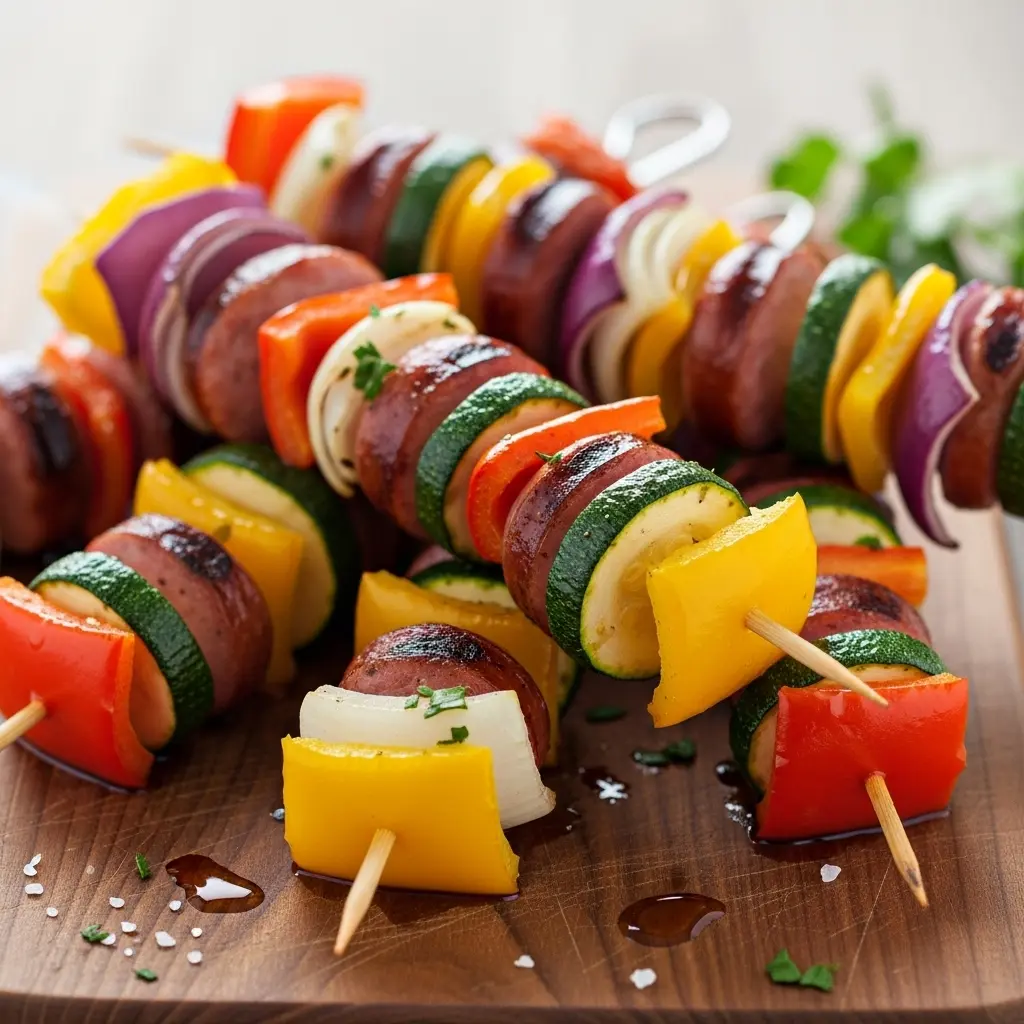 - Thread the sausage, pineapple, and bell pepper onto skewers.