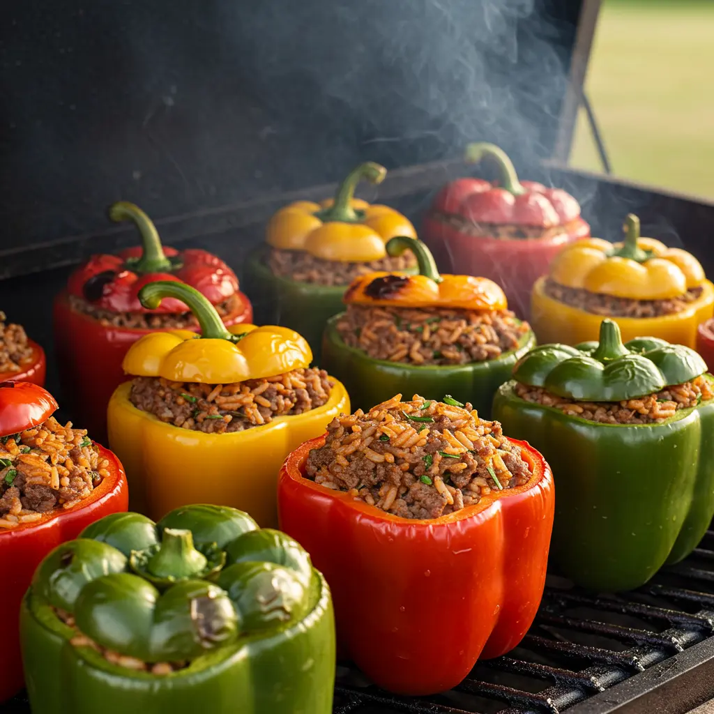 Bell peppers are hollowed out and filled with a savory mixture of ground meat (beef or turkey), rice, and seasonings, then smoked until tender and flavorful.