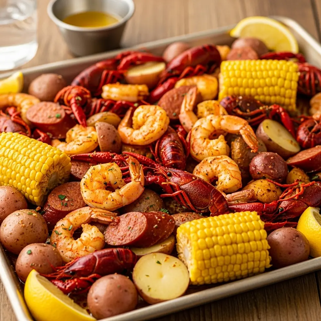 3. Toss shrimp, corn, and potatoes with melted butter and seasoning on a large sheet pan.