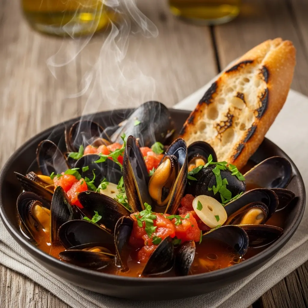 A rustic, dunkable dish. (Ensure mussels are fresh and closed before cooking).