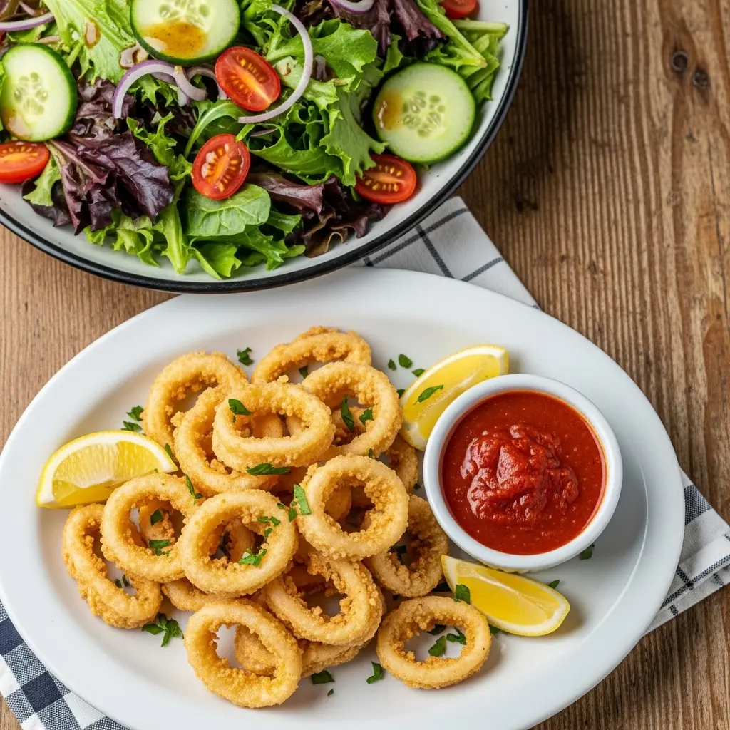 3. Dredge squid rings in the flour mixture, shaking off excess.