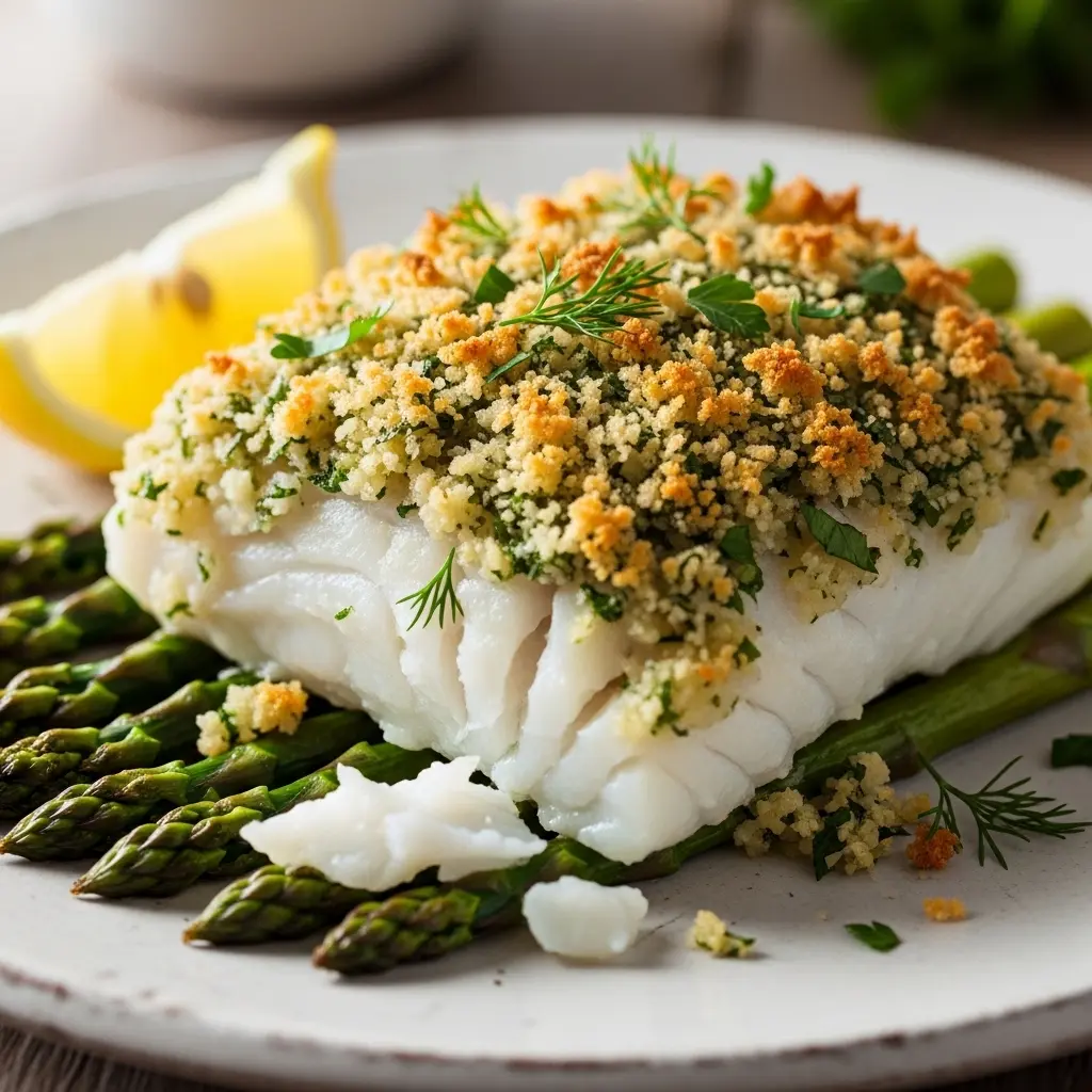 A light and flaky white fish topped with a crispy, savory crust.[1]