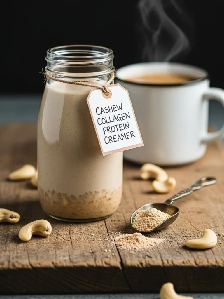 - Blend cashews, fresh water, collagen, honey, and vanilla on high speed until it looks like heavy cream.