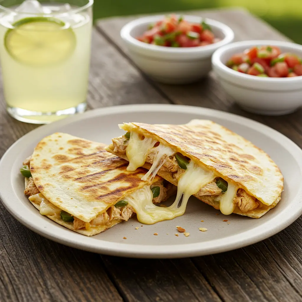 - Place a tortilla in the hot skillet. On one half, layer cheese, shredded chicken, and green chiles.