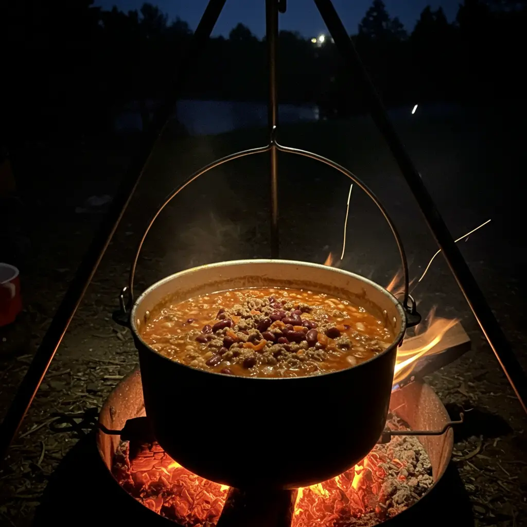 A big pot of hearty chili simmering over the fire is the definition of a perfect camping evening.