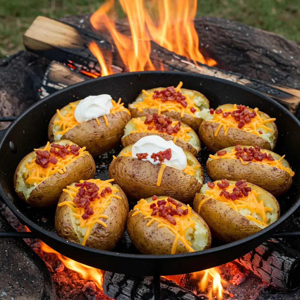 Like a loaded baked potato, but better, because it’s cooked in a skillet over the fire.