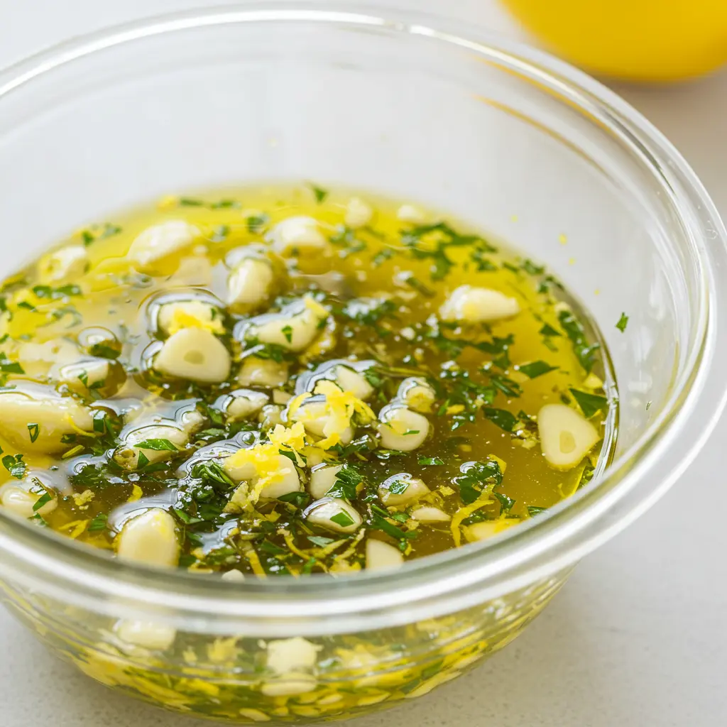 2. In a bowl, whisk together olive/avocado oil, lemon juice, lemon zest, minced garlic, rosemary, thyme, salt, and pepper.
