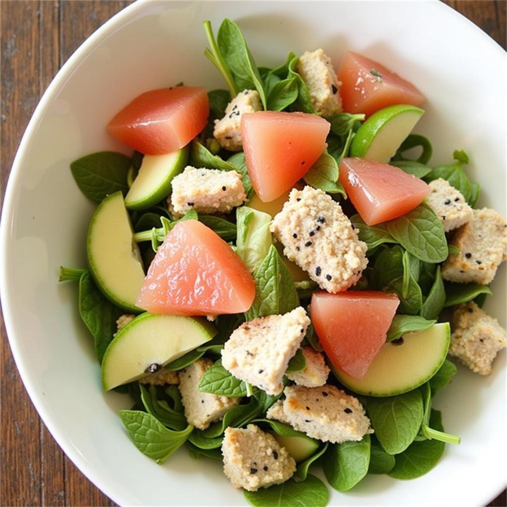 - In a large bowl, combine the chicken slices, grapefruit segments, cucumber, and mint leaves.