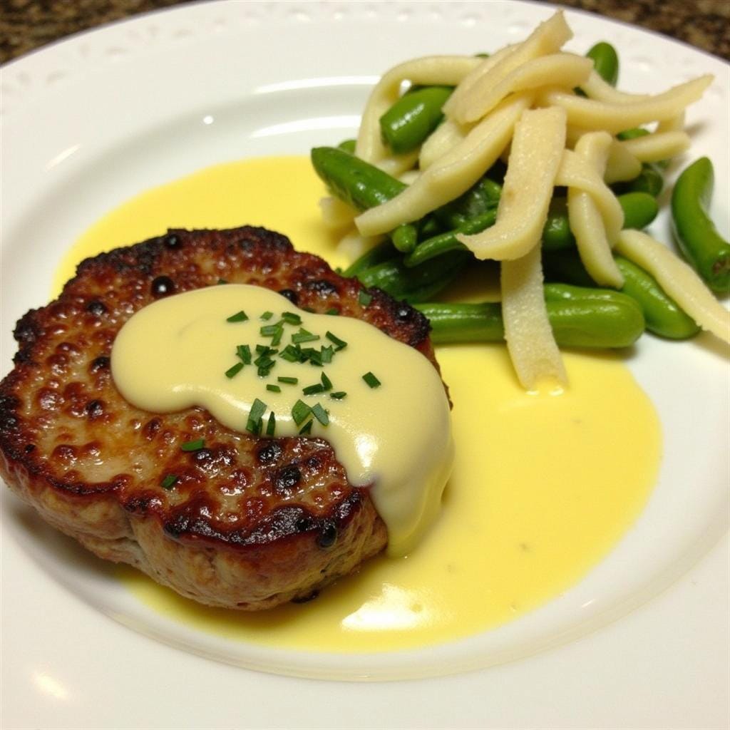- To make the béarnaise sauce, melt butter and whisk with egg yolks, vinegar, and tarragon.