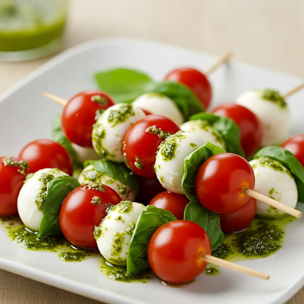 4. Pesto Caprese Skewers: Tiny Bites, Big Flavor