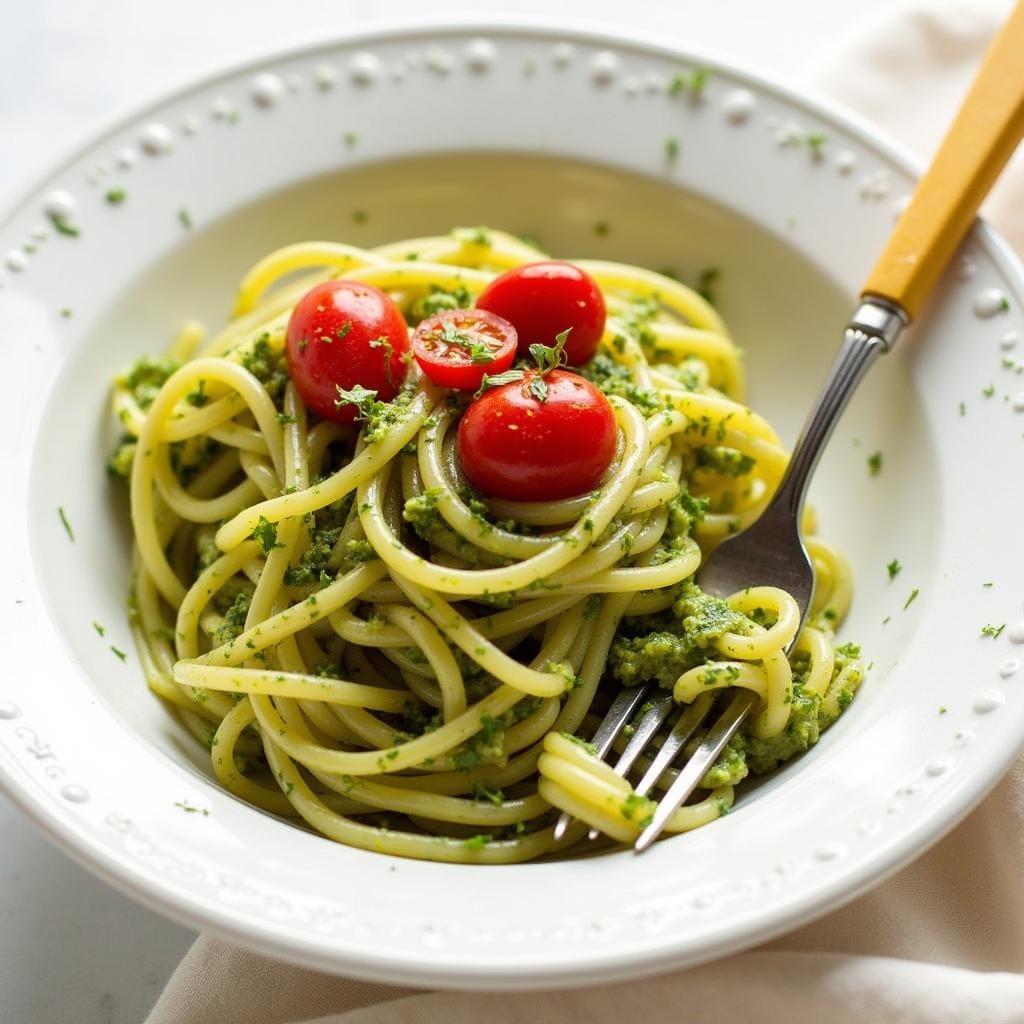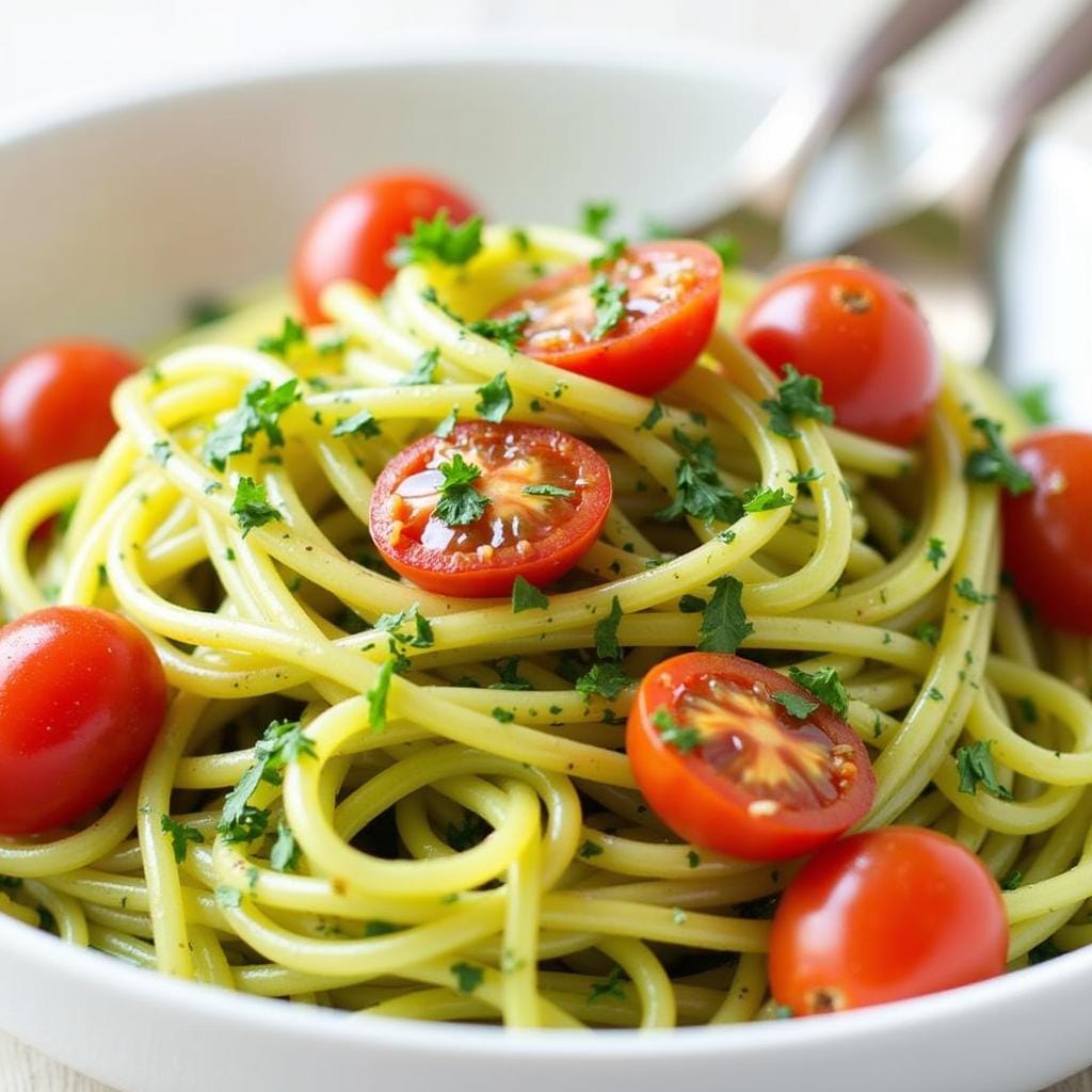 A fresh and flavorful dish with basil pesto and roasted cherry tomatoes.