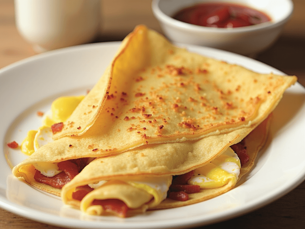 - Place a crepe in a skillet and add scrambled egg, crumbled bacon, and shredded cheddar cheese.