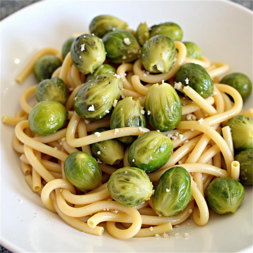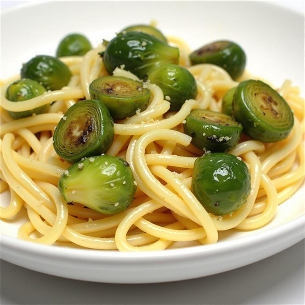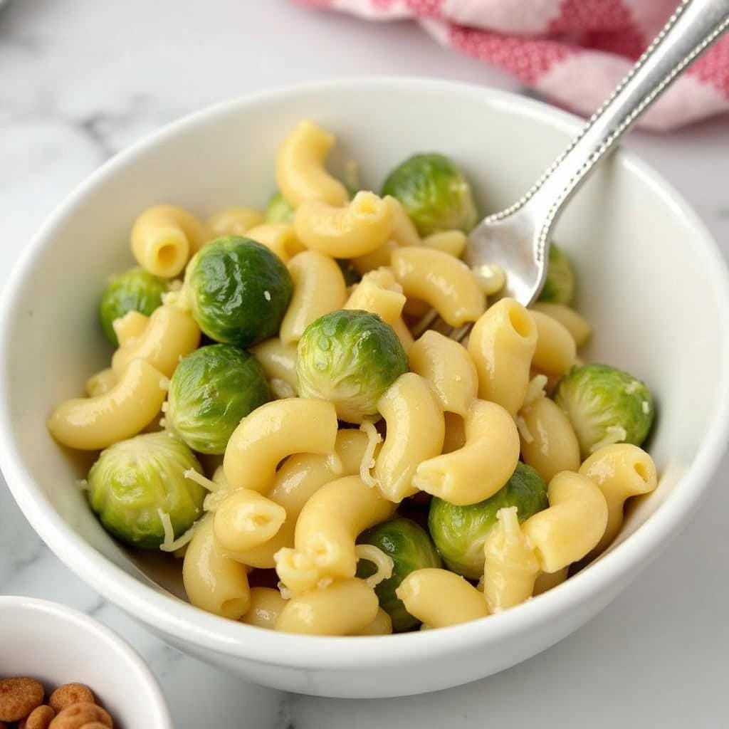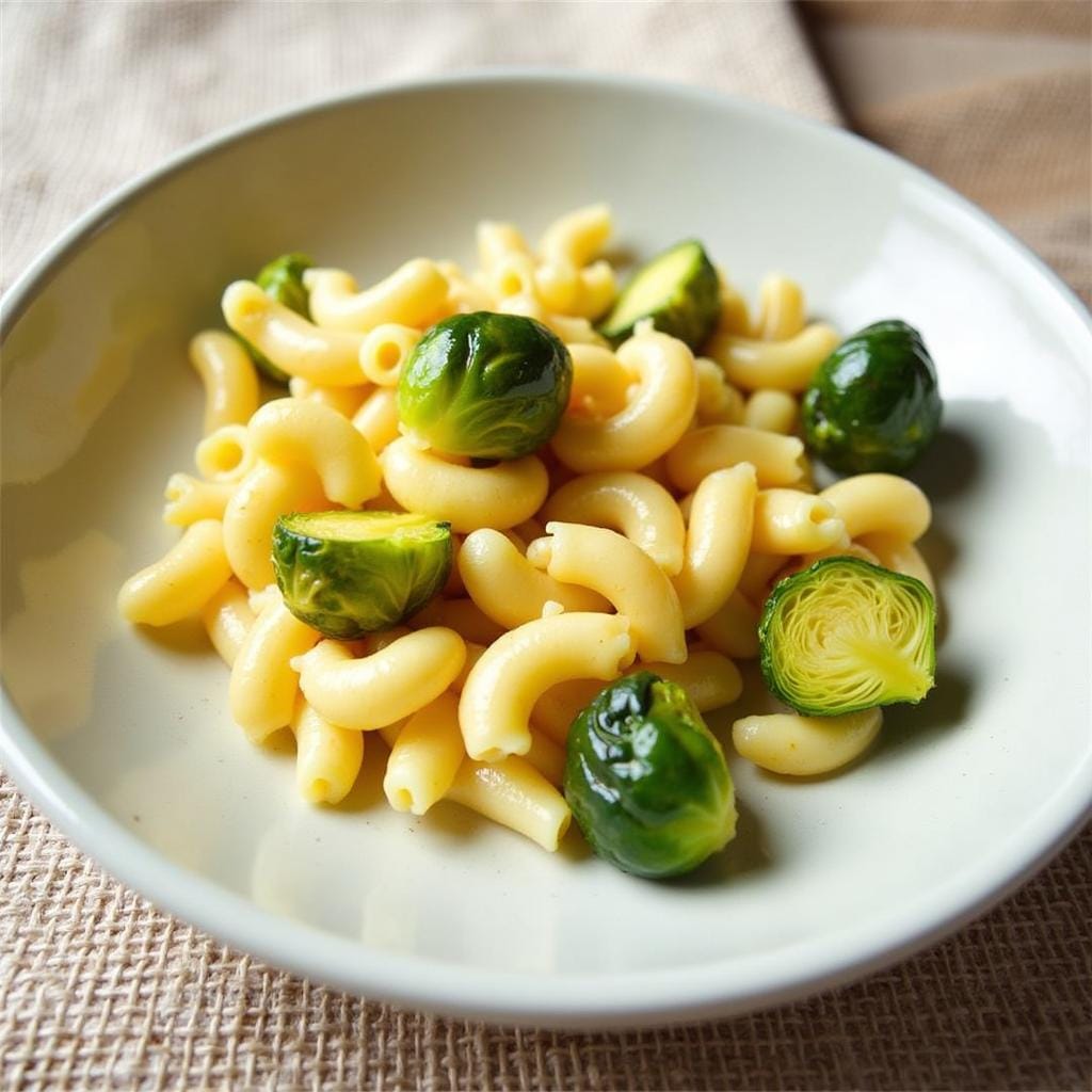 A rich, creamy pasta dish with crispy sprouts.