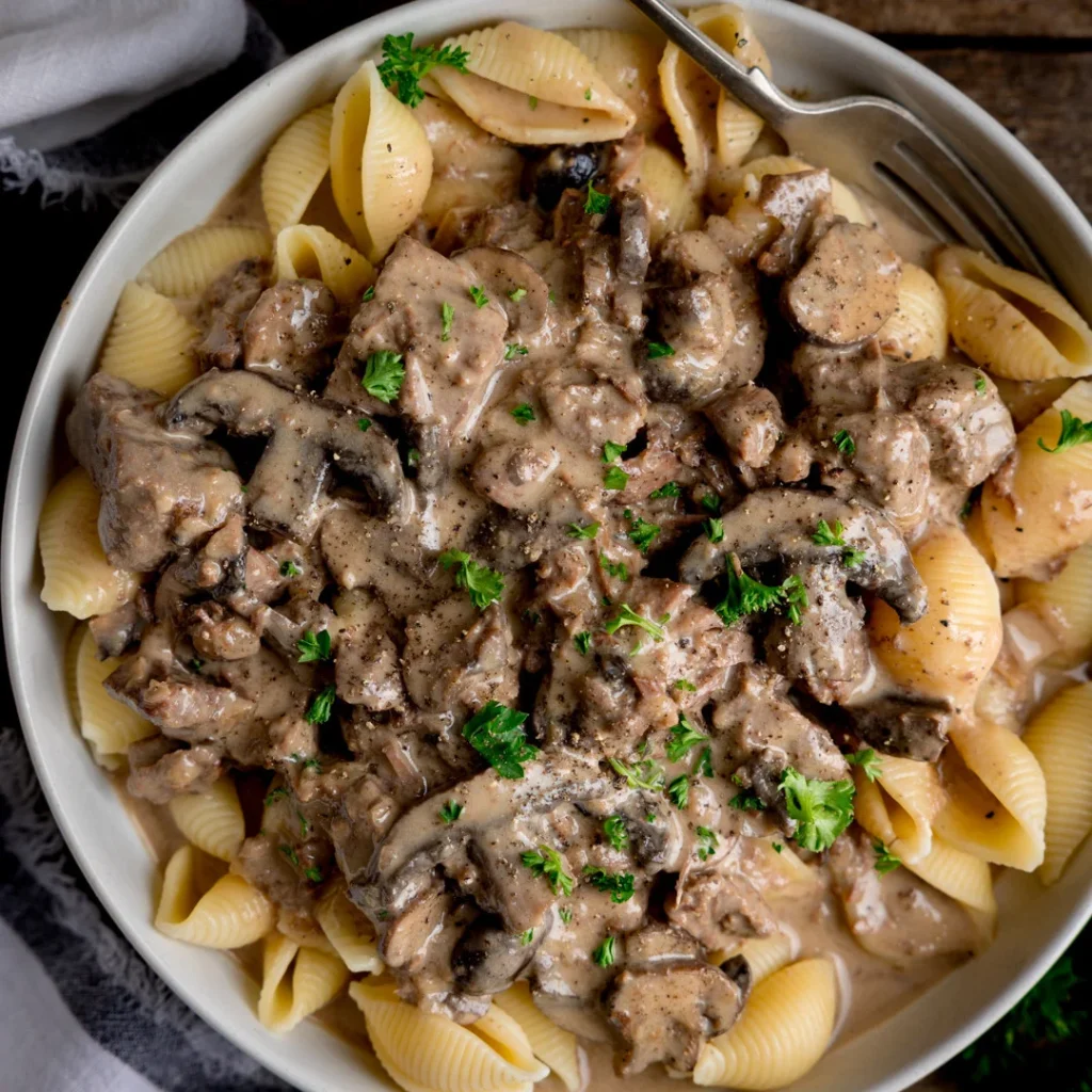 - Place beef, cream of mushroom soup, onion, paprika, salt, and pepper in the crockpot.