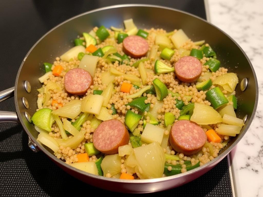 - Heat olive oil in a skillet over medium heat and sauté onion and garlic until fragrant.