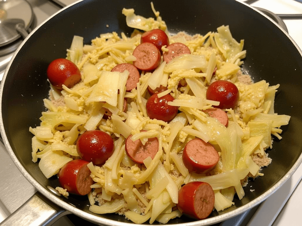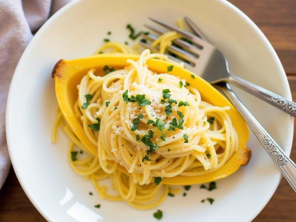 - Add spaghetti squash to the skillet and pour in the egg mixture, stirring quickly to create a creamy sauce.