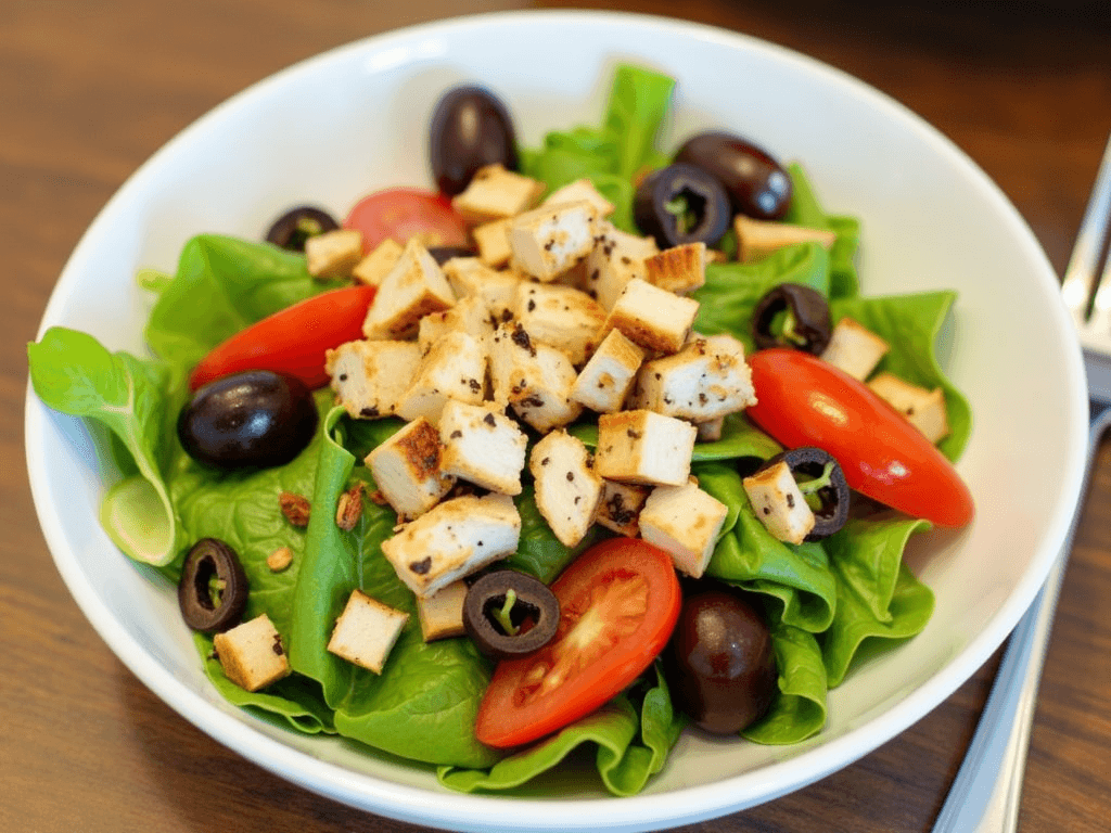 - In a large bowl, combine lettuce, tomatoes, cucumber, feta, and olives.