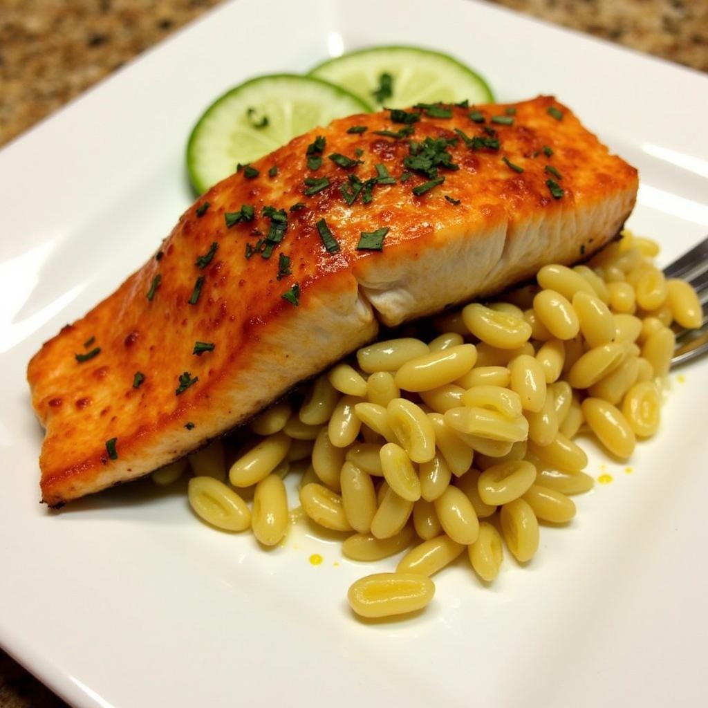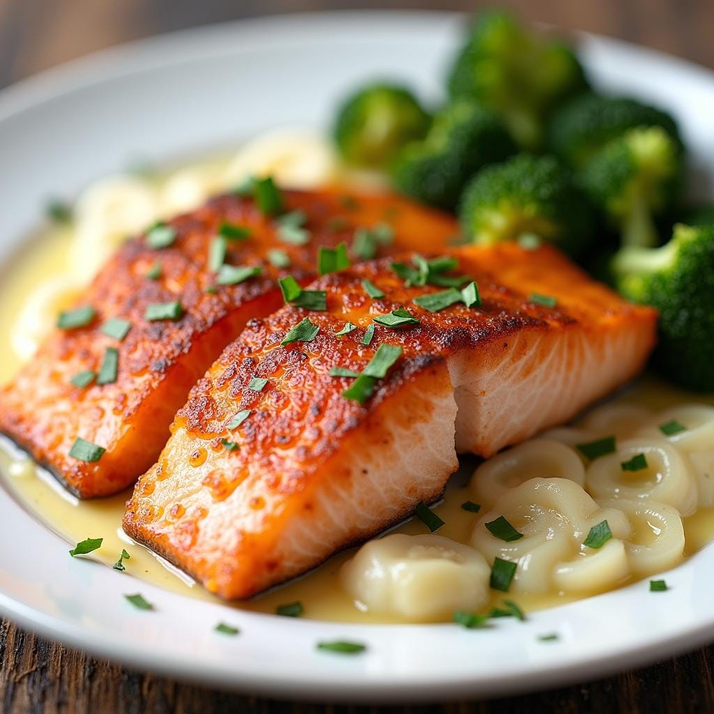 - Season salmon fillets with salt and pepper, then pan-sear for 4-5 minutes per side.