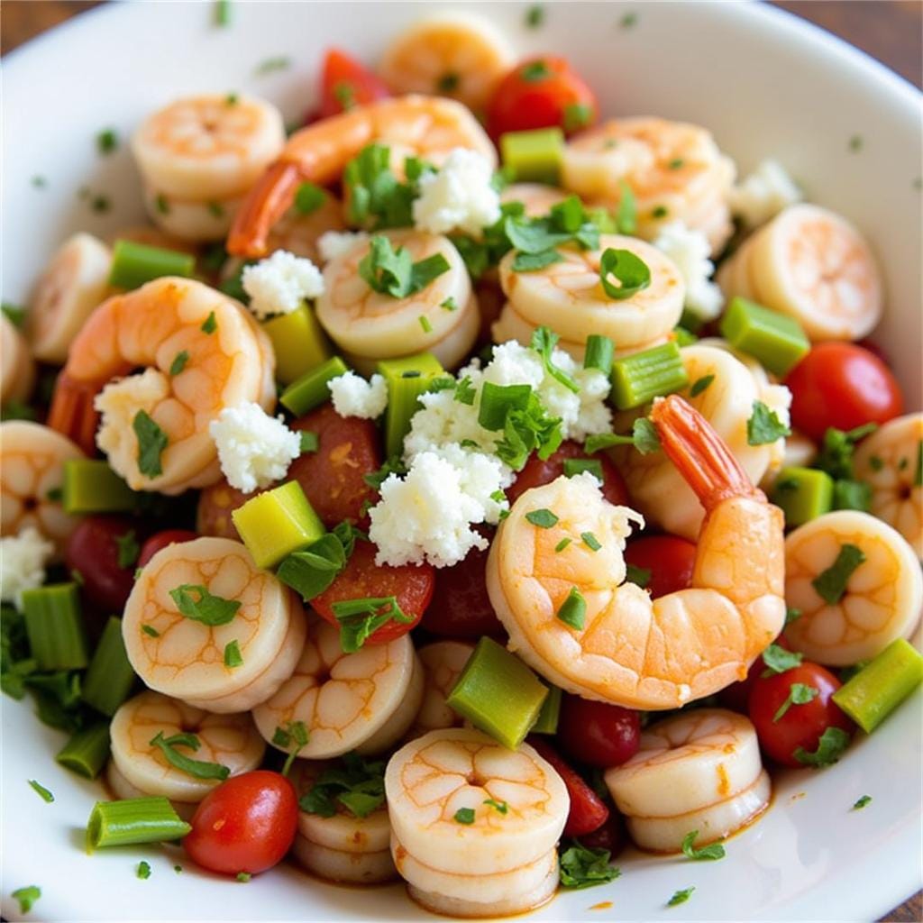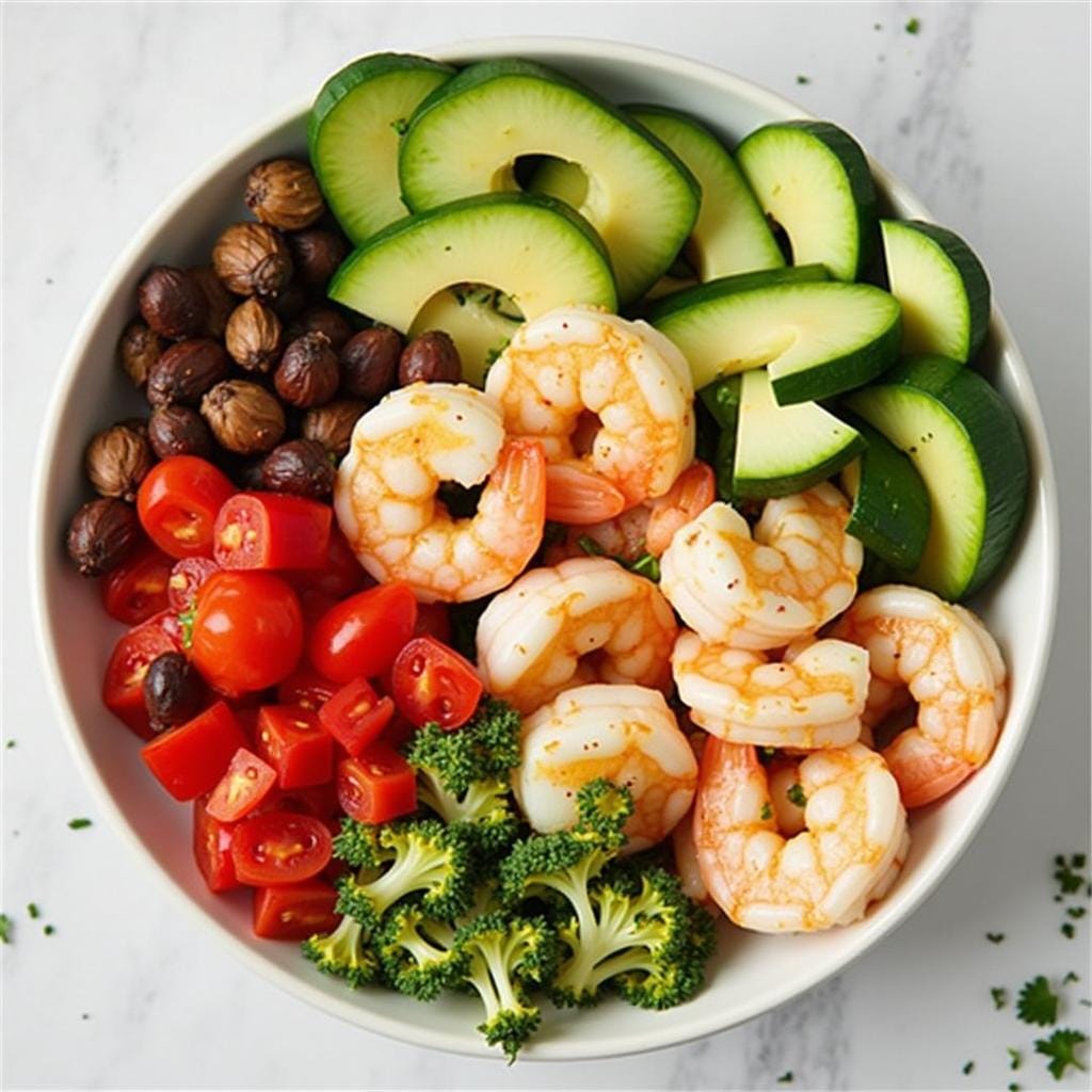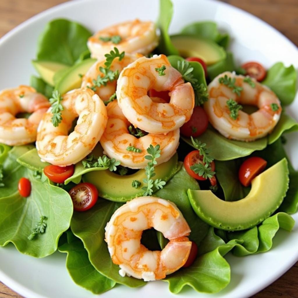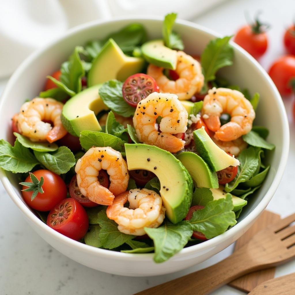 Shrimp tossed with avocado, cherry tomatoes, and a lemon vinaigrette creates a nutritious and flavorful salad.