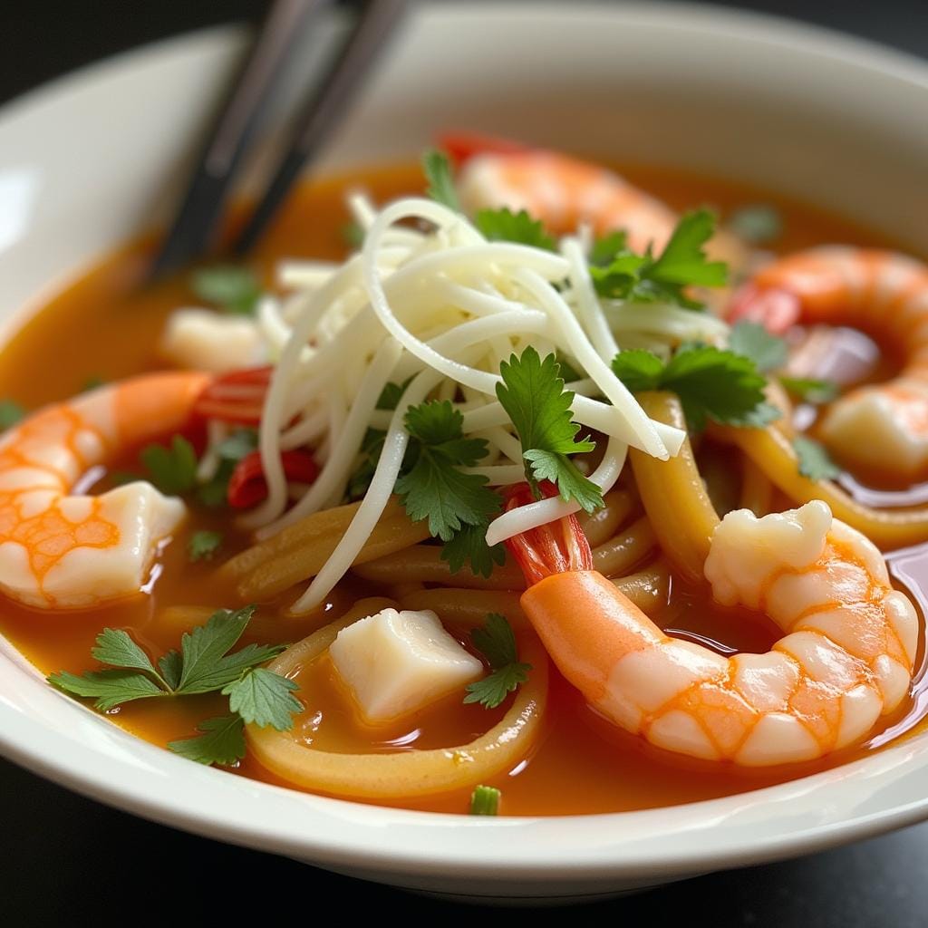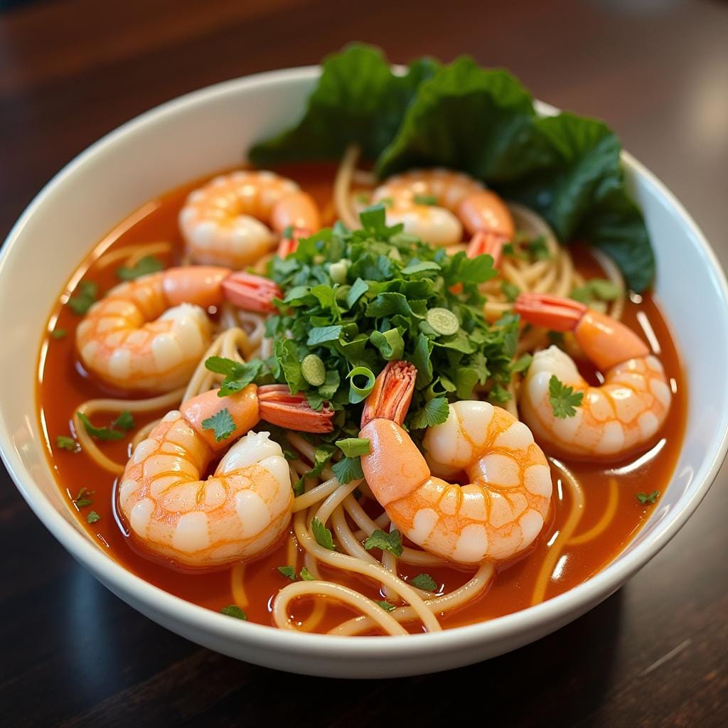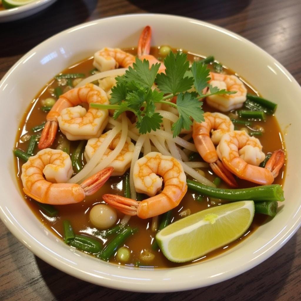 This light and fragrant noodle soup features shrimp in a flavorful broth with fresh herbs and rice noodles.