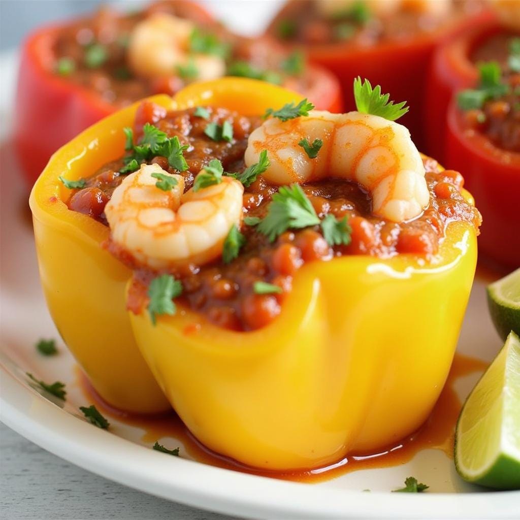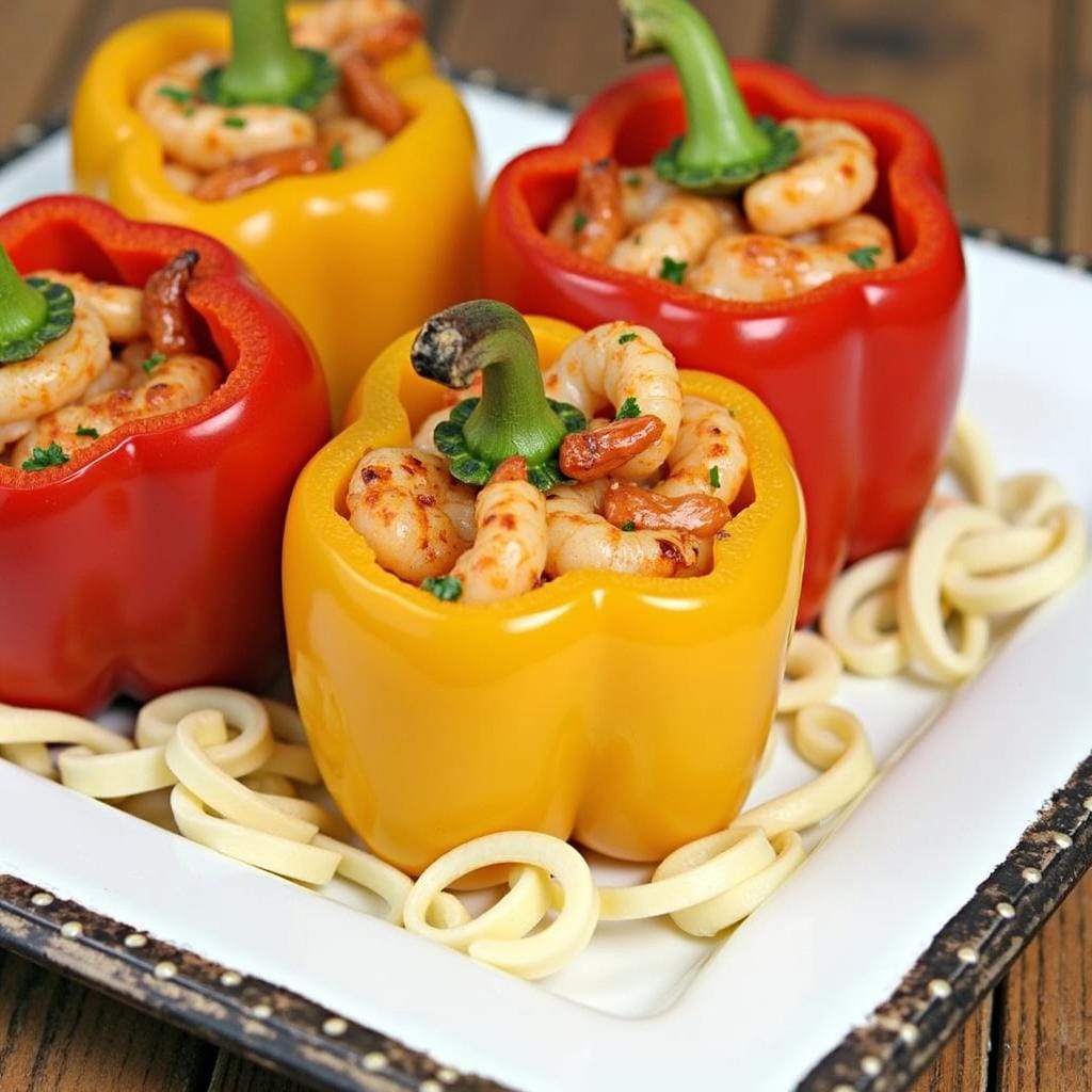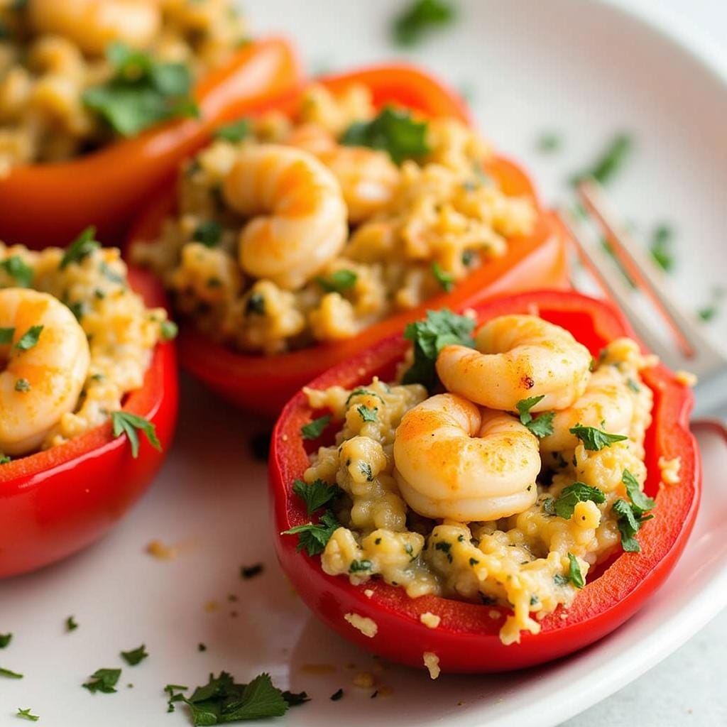 Bell peppers filled with shrimp, rice, and vegetables are baked to perfection for a balanced and satisfying dish.