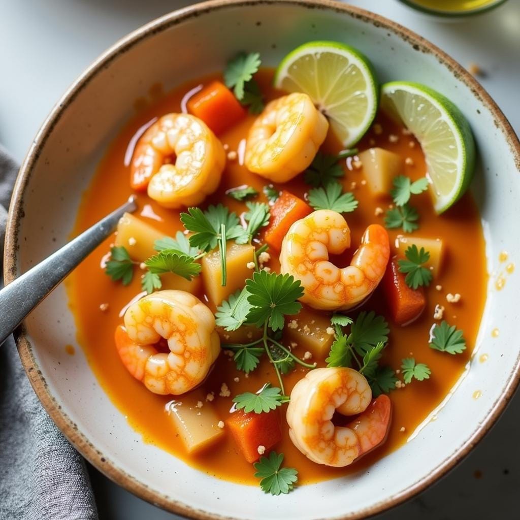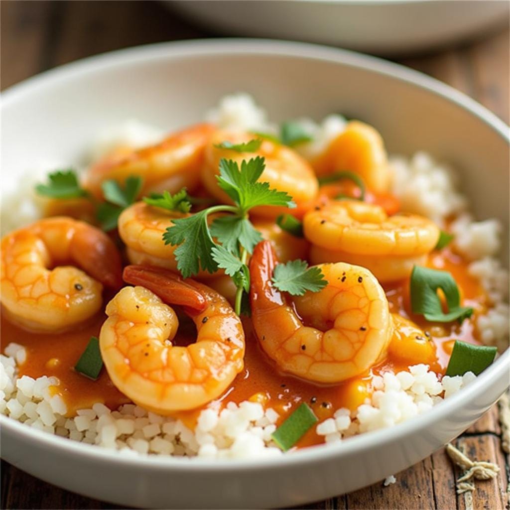 Shrimp simmered in a creamy coconut curry with Thai spices creates a comforting and flavorful dinner.
