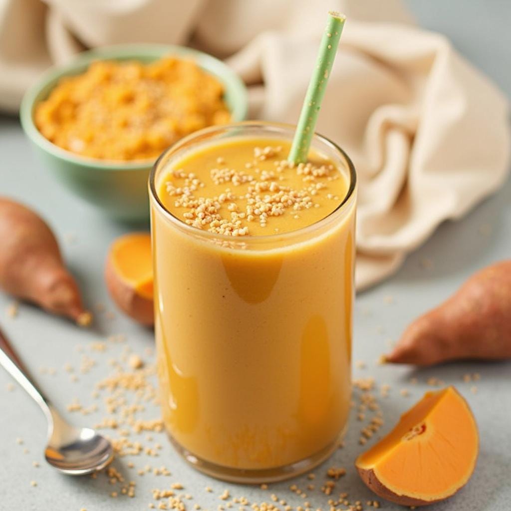 - Blend the cooked sweet potato, banana, almond milk, chia seeds, and cinnamon until smooth.