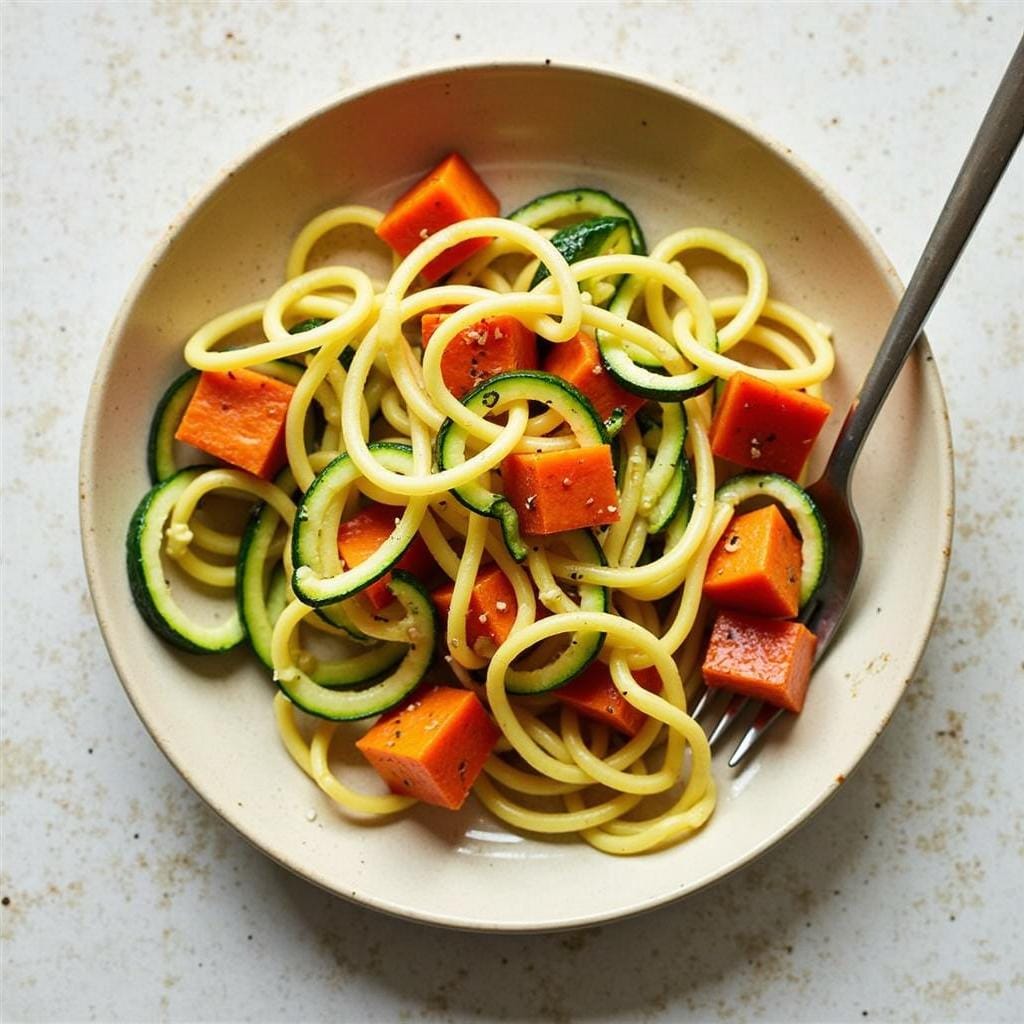 - Heat olive oil in a skillet and sauté the sweet potato and zucchini noodles for 3-4 minutes.