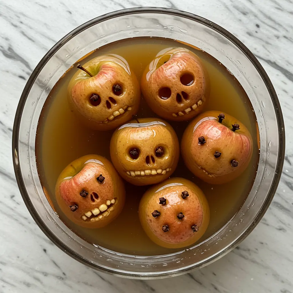 - Float the shrunken apple heads in the warm cider. Stick whole cloves into the “eye sockets.”