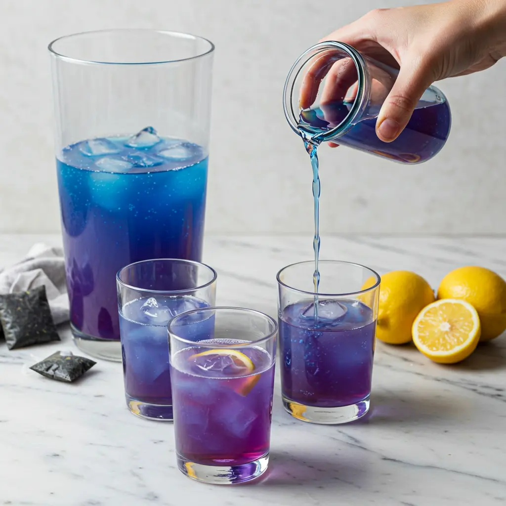 - Pour the blue tea into glasses.