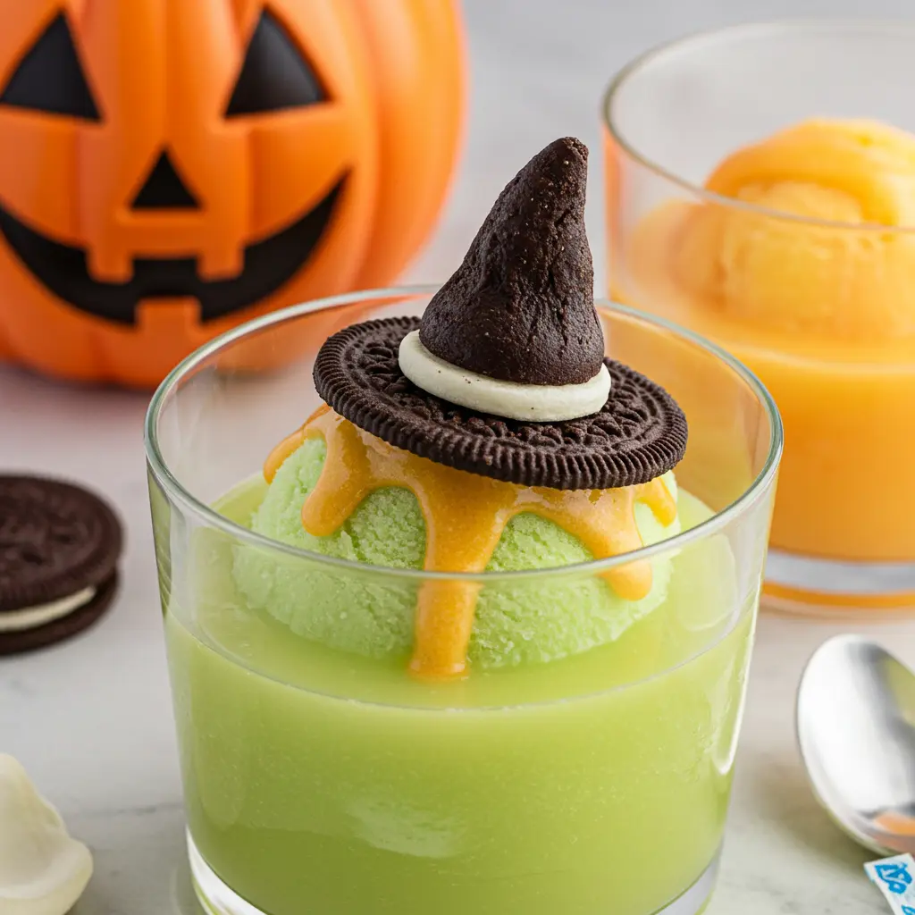 - Use a dab of icing to “glue” a chocolate kiss to the center of a chocolate cookie. Place this “witch hat” on a scoop of sherbet so it looks like it’s sinking.
