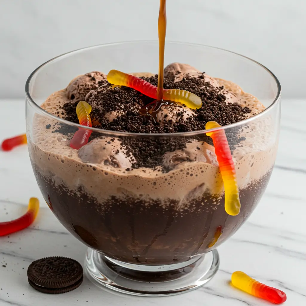 - Pour the dark soda into a wide, shallow punch bowl.
