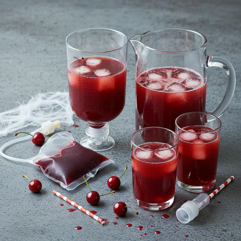 - In a large pitcher, mix all the juices together. This is your “blood.”