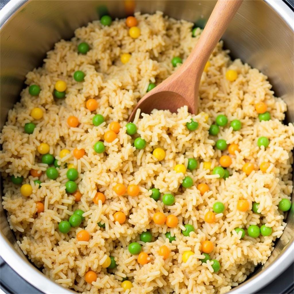 • Add rice, peas, carrots, and soy sauce.