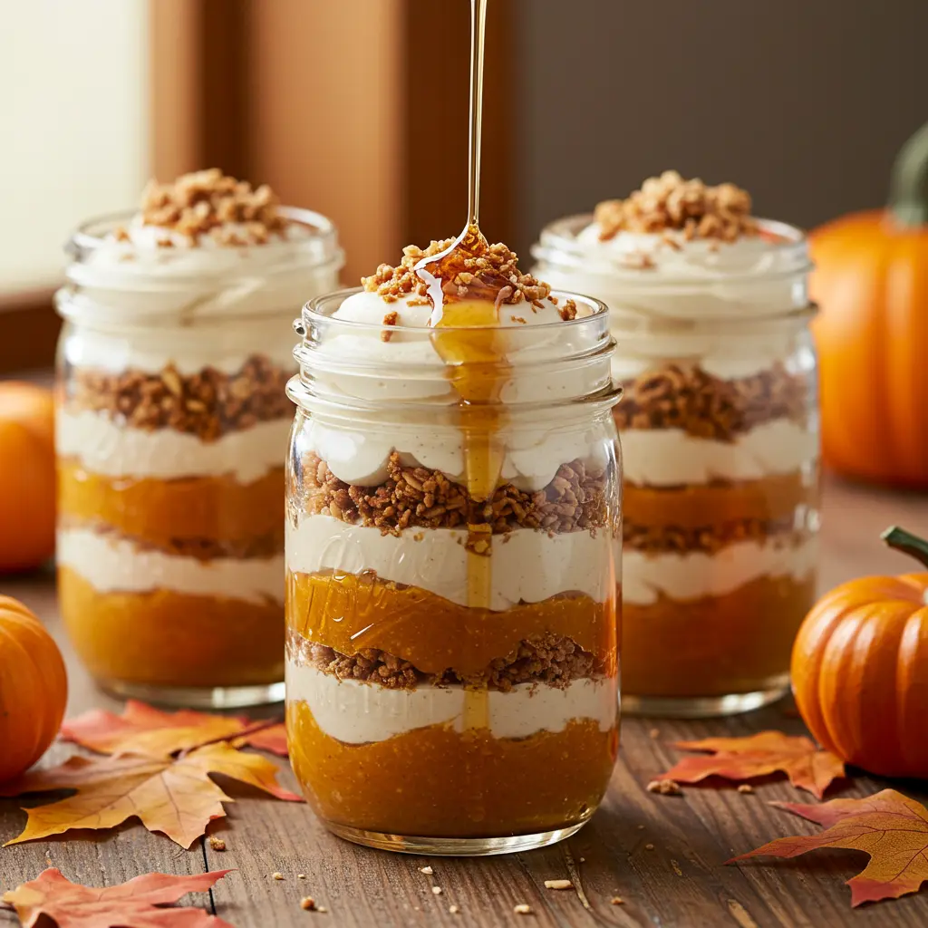 - In small glass jars or cups, create layers: start with cookie crumbs, then a layer of pumpkin mousse, then a layer of the cream cheese filling.