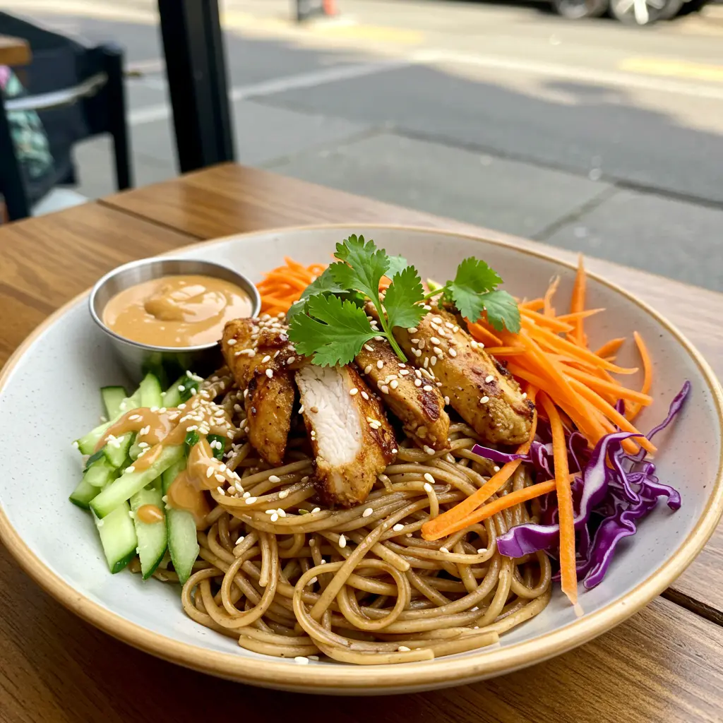 The sauce is key: Peanut butter (or tahini), soy sauce, sesame oil, rice vinegar, a touch of maple syrup or honey, grated ginger and garlic. Whisk it smooth, add water to thin if needed.