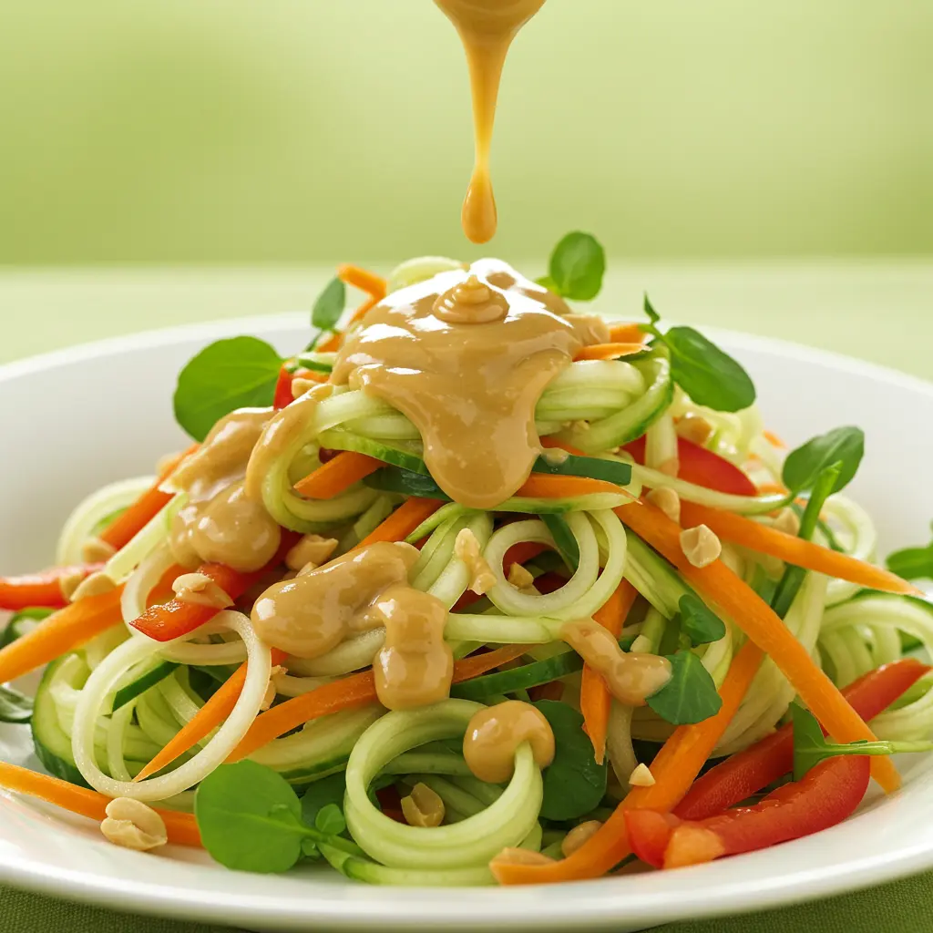 Toss the cucumber noodles with the dressing. Add shredded carrots, cilantro, or chopped peanuts for extra crunch.