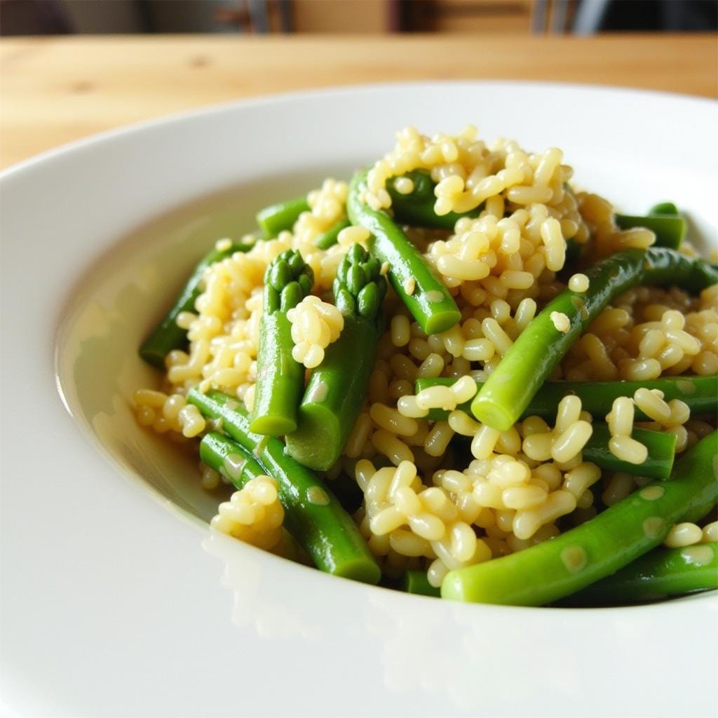 - After 15 minutes, add asparagus and continue to cook until the rice is tender and creamy.